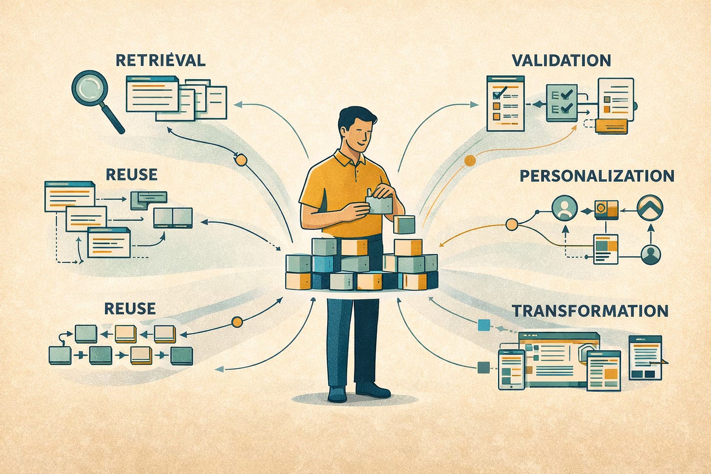 When docs are semantically structured, they become easier to retrieve, reuse, validate, govern, securely personalize, and transform. It becomes easier for both humans (and those pesky machines upon which we rely) to determine what a chunk of content is, how it relates to other chunks, when it applies, what conditions constrain it, and whether it belongs in a given output.