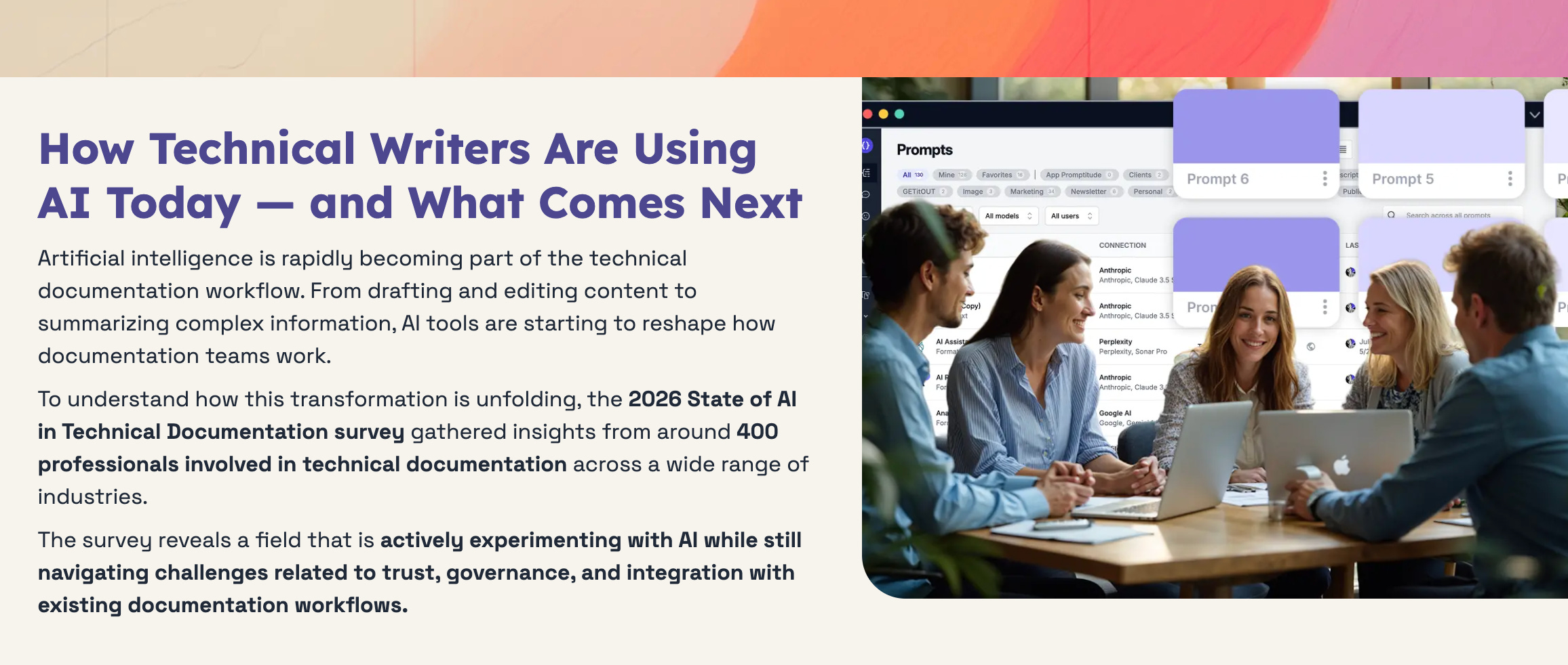 The report offers a useful overview of the findings, including how technical writers are using AI currently, which tasks they support with it most often, and where adoption is still getting hung up on entirely reasonable concerns like trust, governance, and integration.