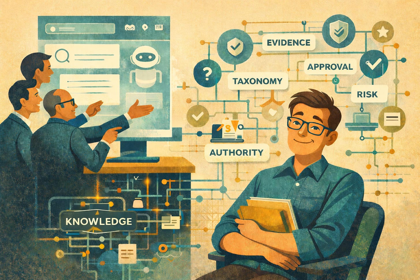 Then explain that somebody still has to determine what counts as knowledge, which sources are authoritative, which answers are safe to deliver, and how the system knows the difference between official guidance and random corporate folklore.
