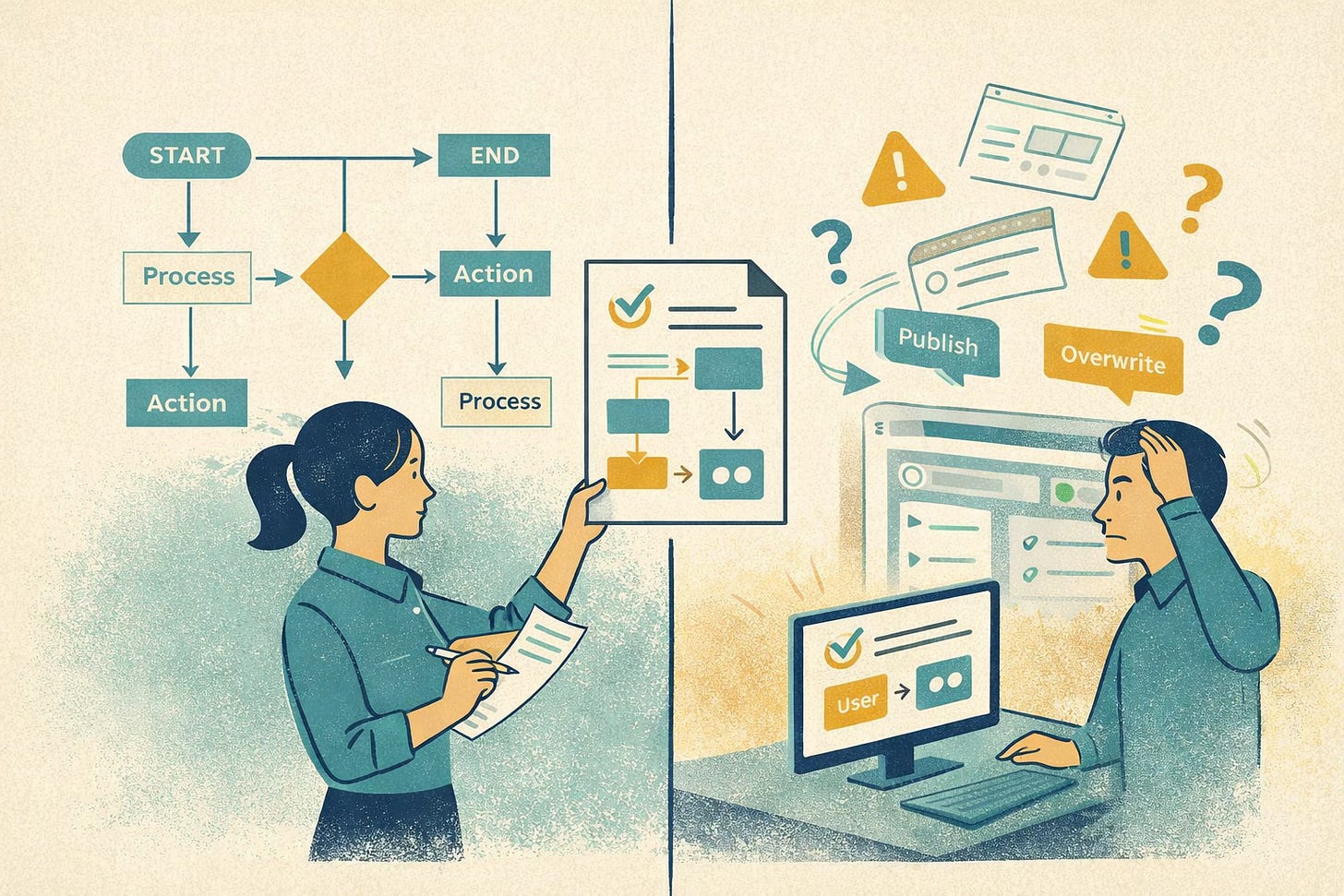 This matters because users do not experience products as architecture diagrams. They experience them as moments: confusion, hesitation, recovery, success, error, relief. Good documentation meets them there. It anticipates where they are likely to get lost, what they are likely to misread, and what they need in order to move forward with confidence.